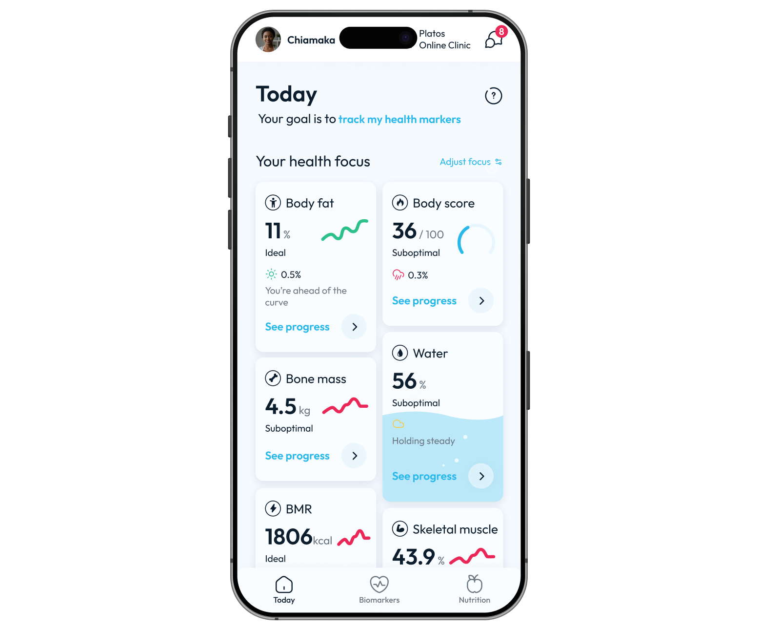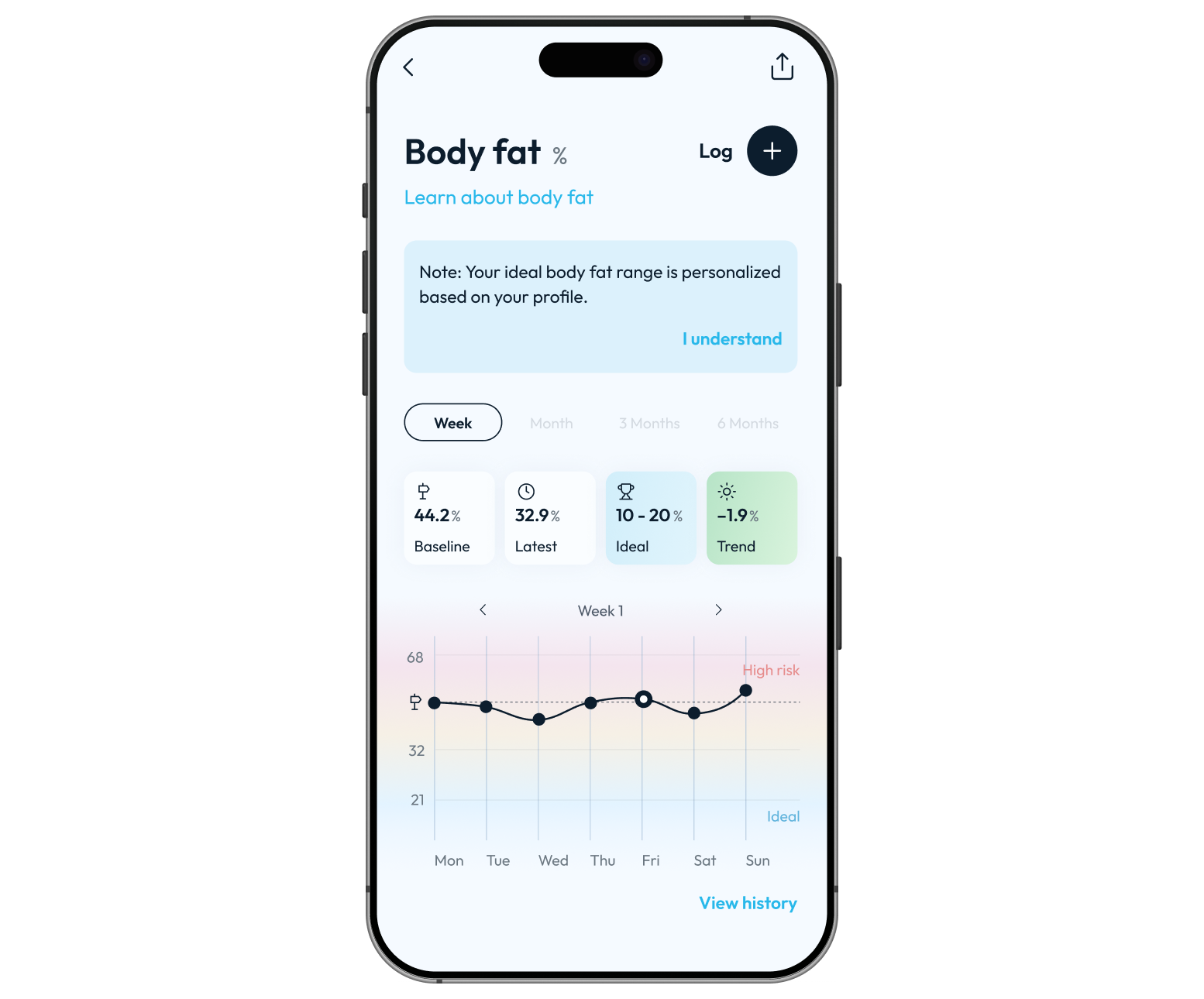 You can now track your body composition and metabolic health markers over time — including: Body fat %, Weight, BMI, Visceral fat, Blood pressure, Blood sugar, Cholesterol …and more.