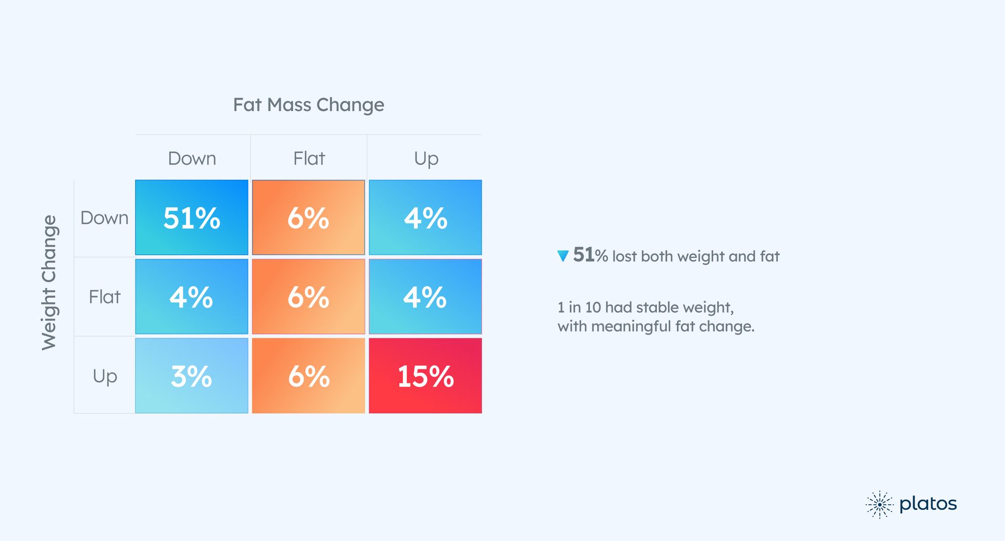 The most common pattern was weight and fat mass moving downward together. However, the data also revealed an important divergence: